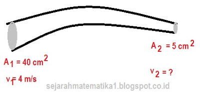 Jika diperhatika pada rumus aturan bernoulli, untuk mencari perbedaan tekanan (P2-P1), diperlukan v1 dan v2. Sementara itu kita belum mempunyai v2. Untuk itu gunakan terlebih dahulu rumus persamaan kontinuitas untuk mencari v2 .